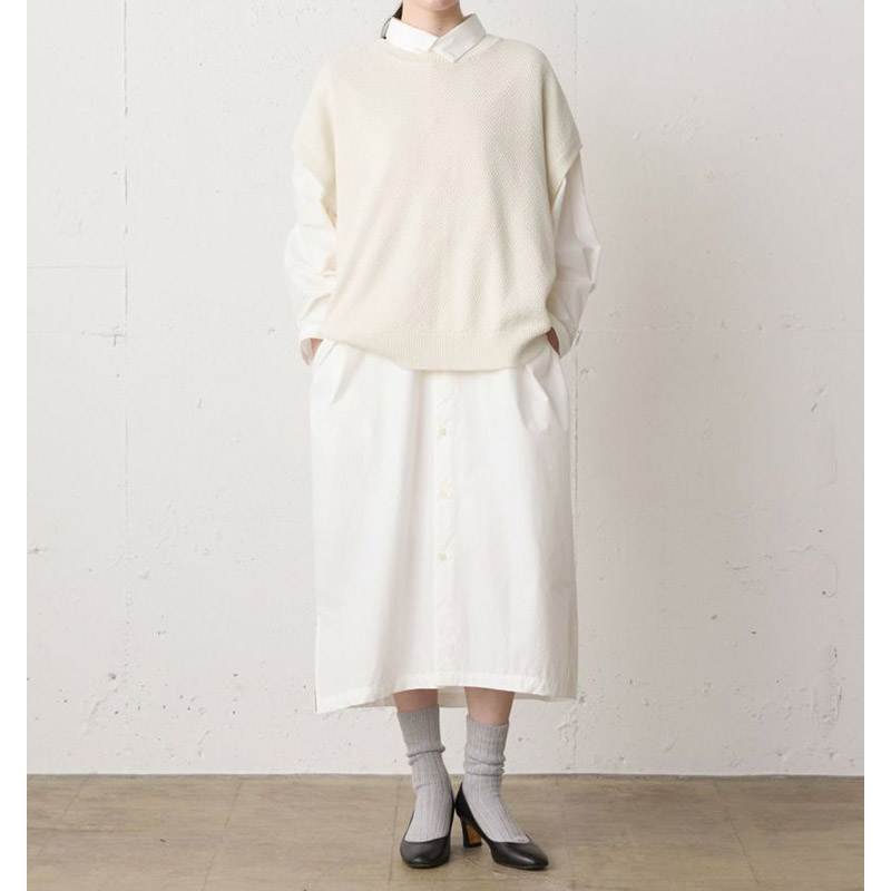 少しシャリ感のあるコットン糸を使用。通気性の良さが特徴でサマーニットとしても、ワンピースやシャツに重ねたベスト使いとしても長く愛用していただける1枚です。