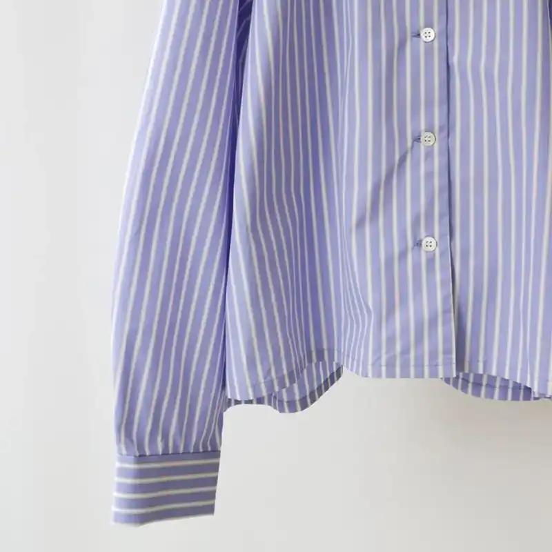 メンズシャツによく用いられる素材ならではの端正な表情で、織りによってストライプ柄がくっきりと浮かび上がる素材感が特徴。