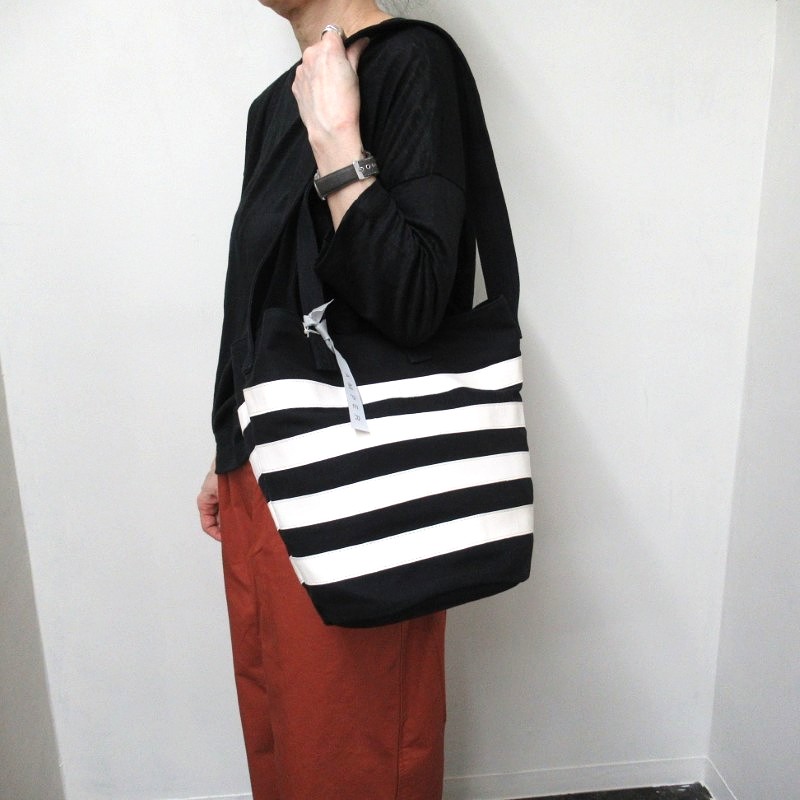 リネンキャンバスとレザーの異素材を組み合わせたボーダーバケツバッグ。