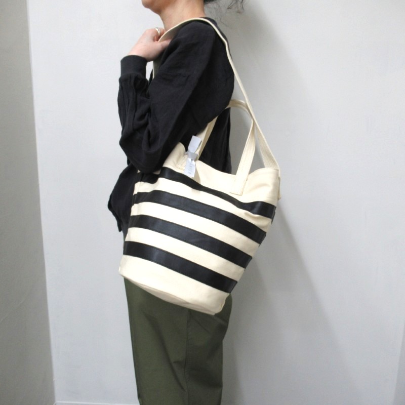 リネンキャンバスとレザーの異素材を組み合わせたボーダーバケツバッグ。
