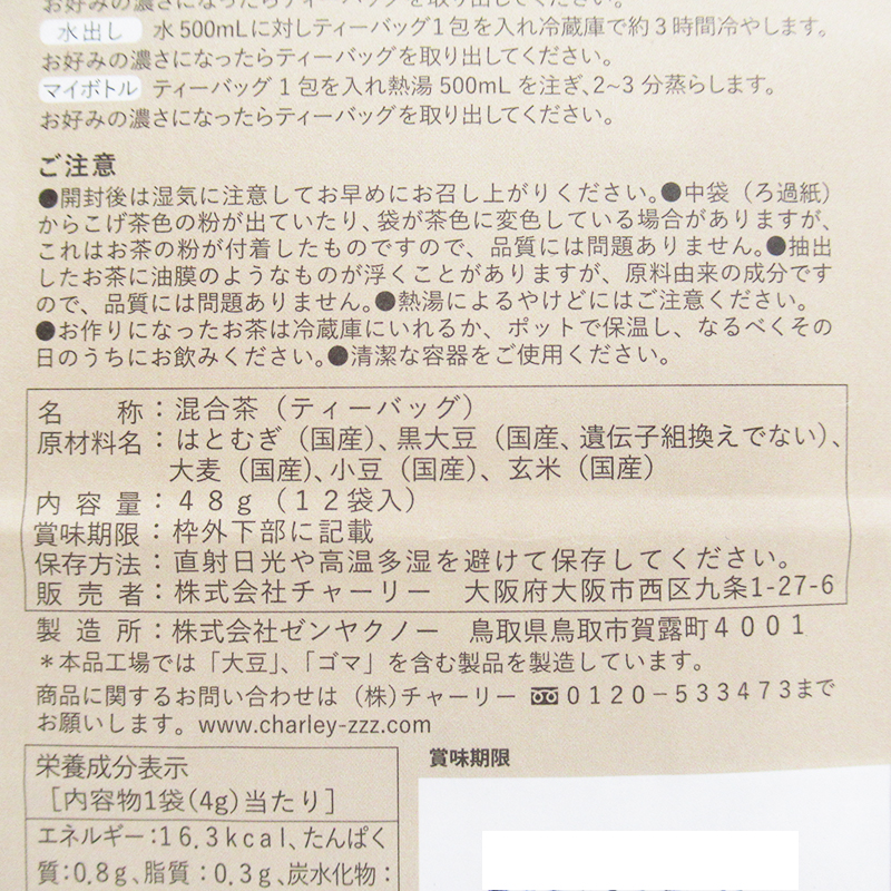 5種類の穀物(はとむぎ、小豆、黒大豆、玄米、大麦)をブレンド。