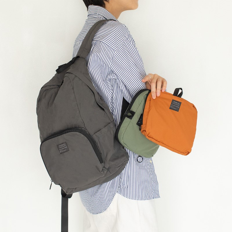 マット調ナイロン生地を使ったパッカブルシリーズ。りんご1個分より軽い約200gの超軽量仕様、身幅に合わせたサイズ感で荷物を入れてもスッキリ持てるリュックです。