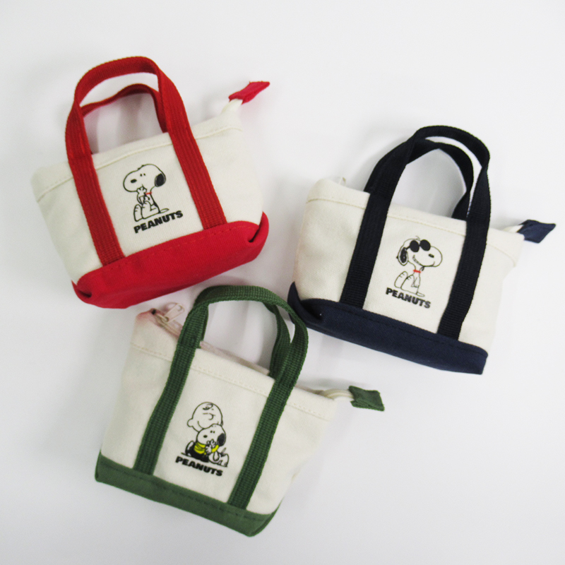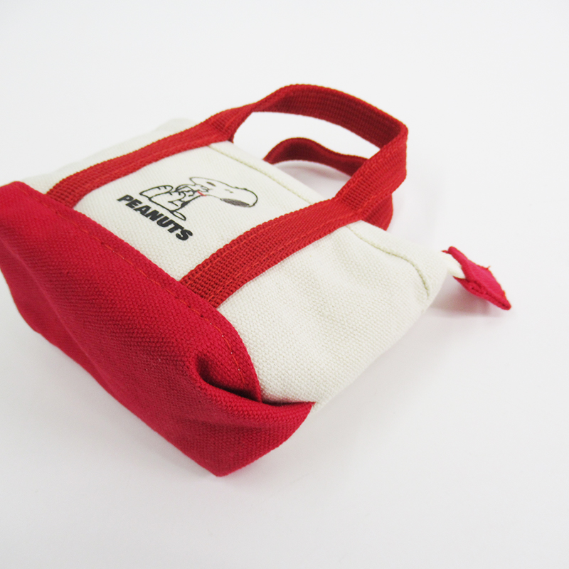 モグモグしたスヌーピーのイラストがプリントされたキャンパストート型の可愛らしいミニサイズのポーチ。コスメや小物の収納にぴったりです。箱入りでギフトにもおすすめです。