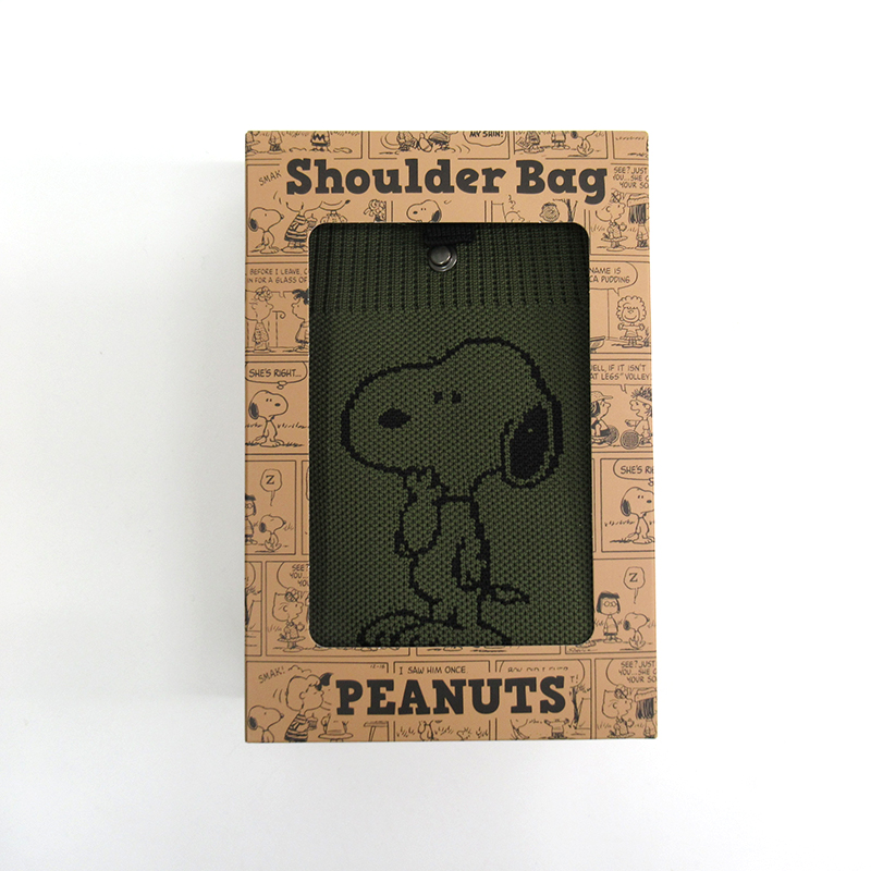 すぐに取り出して使いたいハンカチやスマホなどを入れて肩掛けができる、ニットタイプのショルダーバッグ。シンプルで可愛らしいスヌーピーのデザインと、コーディネートしやすいベーシックなカラーがポイントです。箱入りでギフトにもおすすめです。