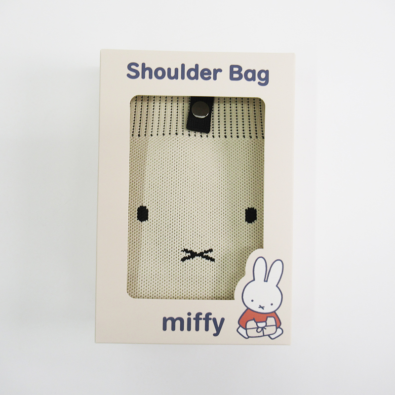 ミッフィーのお顔デザインがかわいいニットショルダーバッグ。すぐに出し入れがしたいスマホやハンカチ、ポケットティッシュなどを入れられて便利です。箱入りでギフトにもおすすめ。