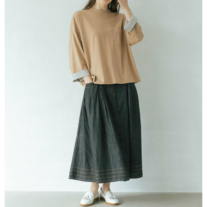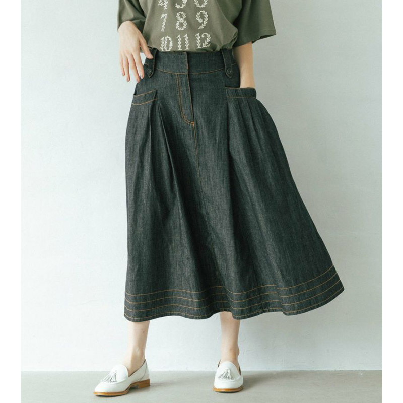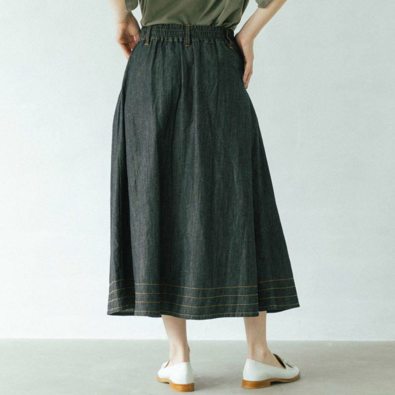 5.5ozの薄くて軽いデニムのタックスカート。ライトオンスデニムならではの軽さとドレープ感があります。