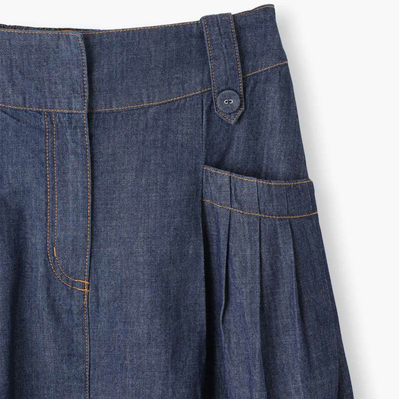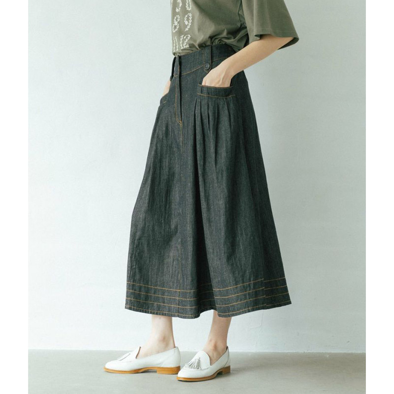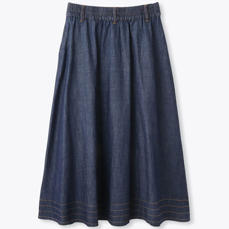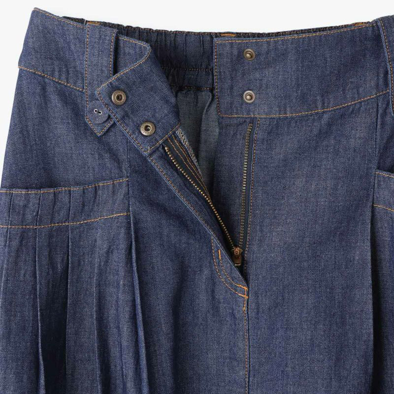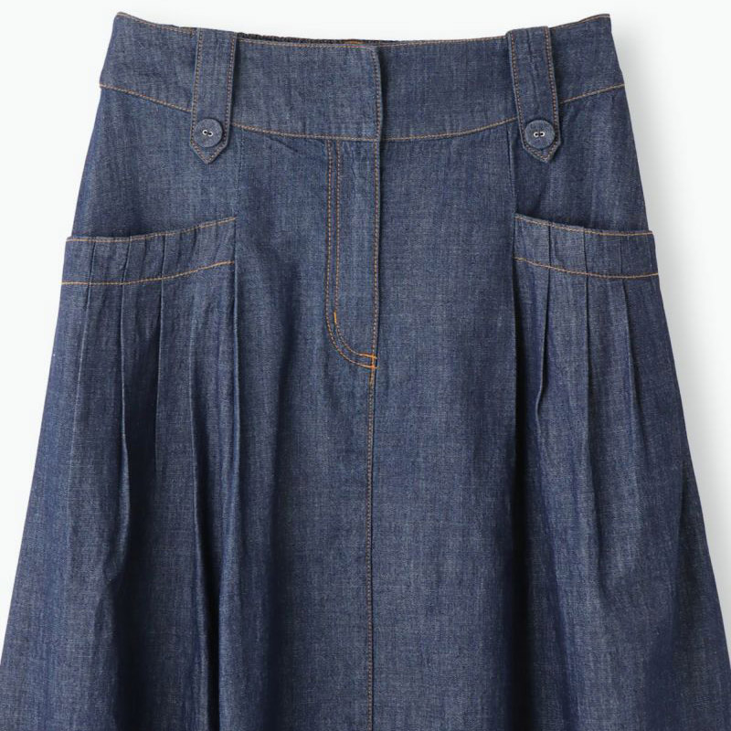 5.5ozの薄くて軽いデニムのタックスカート。ライトオンスデニムならではの軽さとドレープ感があります。