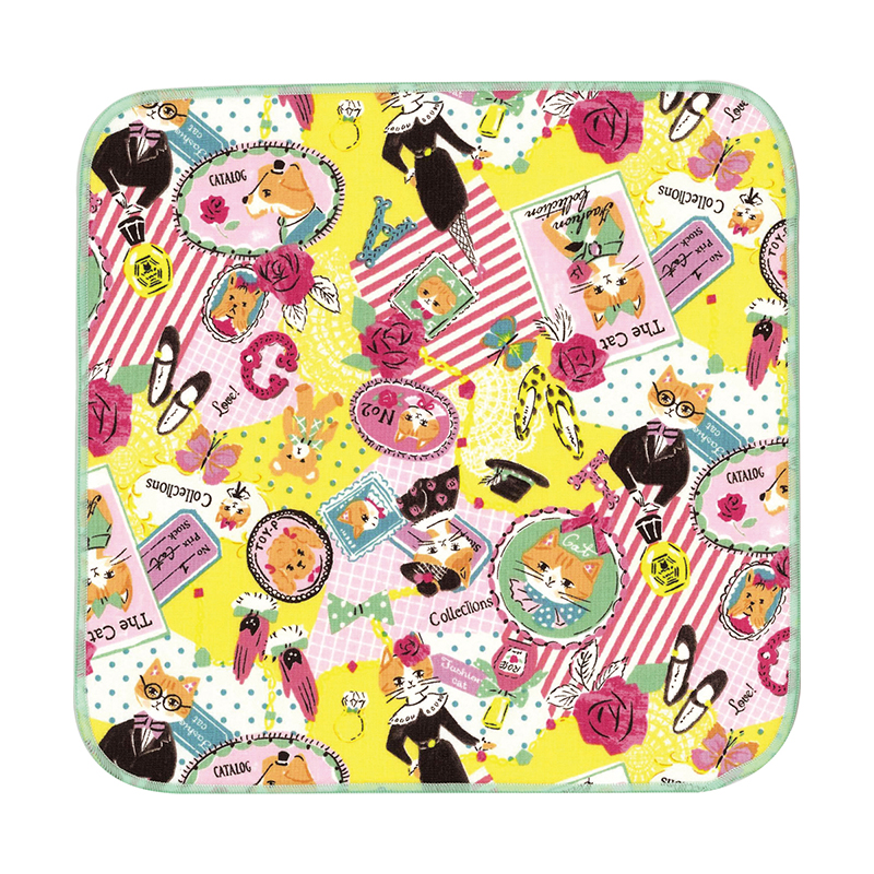 持ち運びに便利なサイズ感で、柔らかく(softly)、吸収性の高いねこ柄パイルハンカチです。