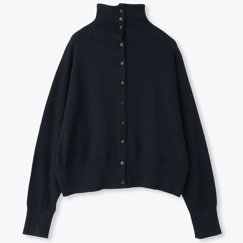 ハイネックの衿元が上品なアクセントのカーディガン。