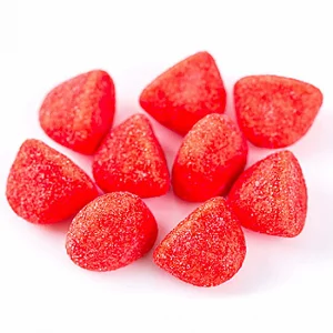 イチゴのような見た目をした、赤と白の2層構造のグミです。表面はサクッと、中はもちっとした食感が特徴で、甘酸っぱいイチゴ味。グミのような、マシュマロや綿あめのような不思議な食感がクセになりますよ。