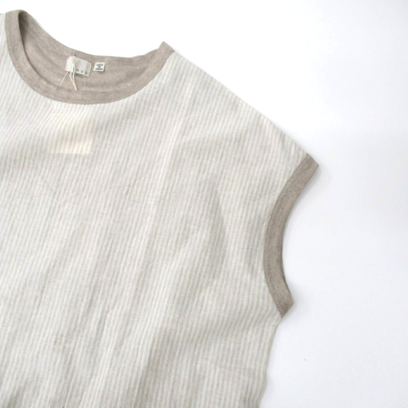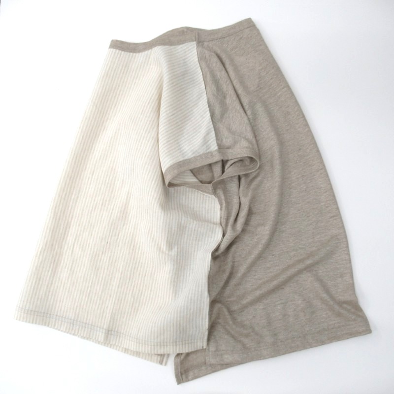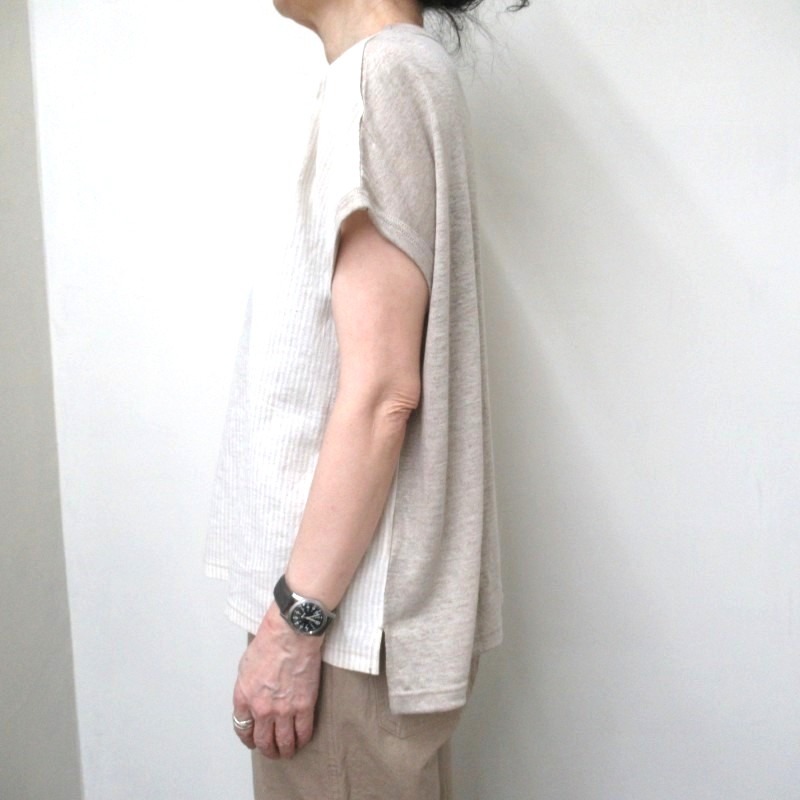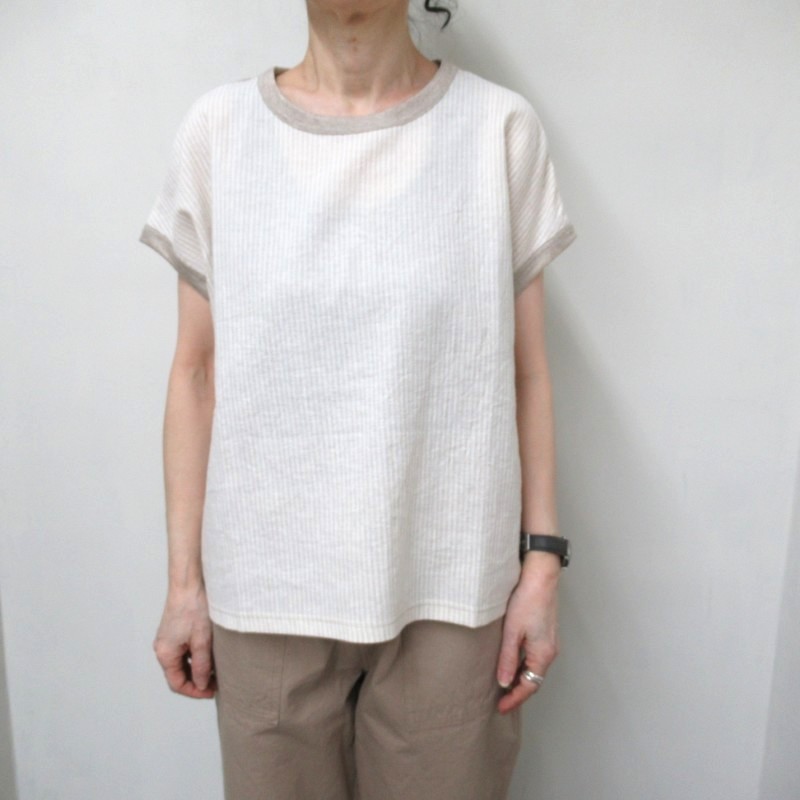 ストライプの布帛と無地のリネン生地で切り替えたプルオーバー。