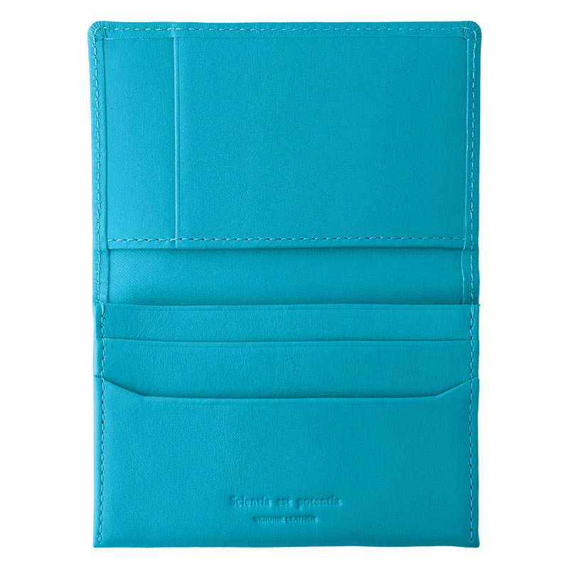 カラフルなソフトレザーでつくった二つ折りの名刺入れです。シンプルな仕上げながら、メインの名刺入れの他に4ヶ所のカードポケット付きで、カードケースとしても使えます。