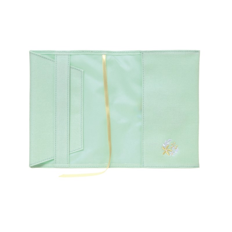 やさしい色合いの本体に、草花と動物の愛らしい刺繍が映えるブックカバーです。