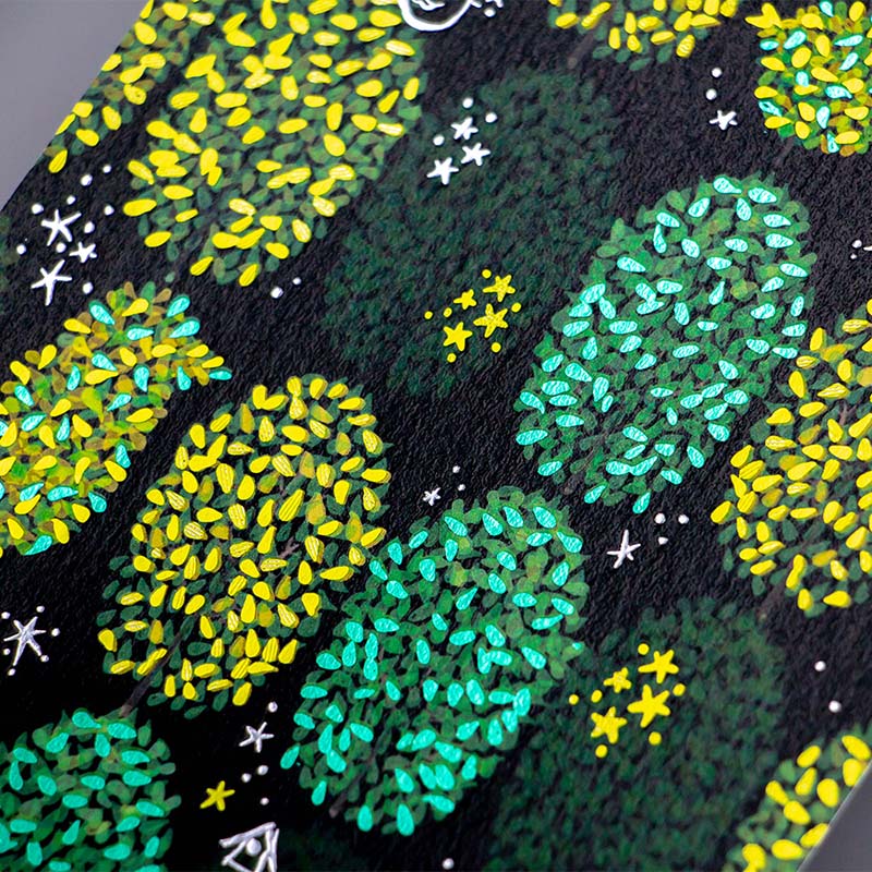箔押しブランドROKKAKUとコラボした本商品は、散りばめられた箔に光が当たると美しく輝き、詩の世界を鮮やかに表現しています。