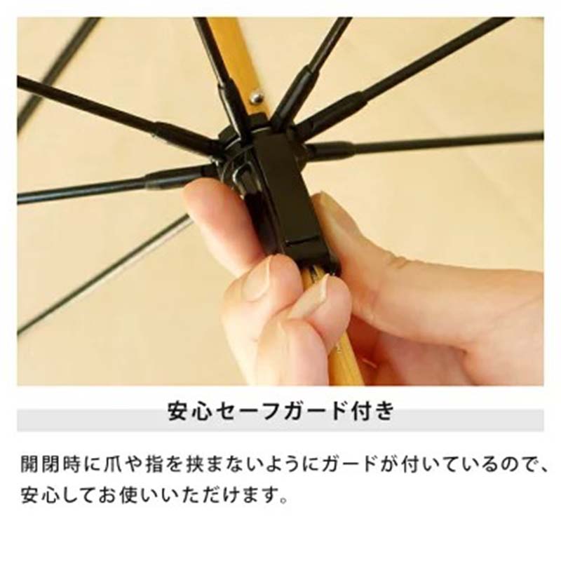 | 備考 | Safe Guard(セーフガード) 開閉時に指や爪を傷めないようにロクロ部分に安全カバーが付いています。 傘を開く時は親指を添えてカチッと音がするまで傘を広げてください。抑えたまま広げると開けない場合があります。 |