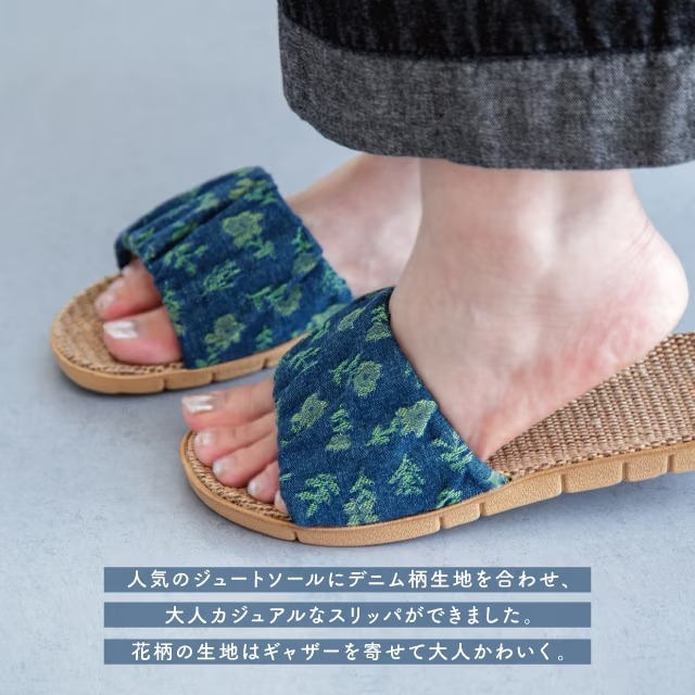人気のジュートソールにデニム柄生地を合わせ、大人カジュアルなスリッパができました。