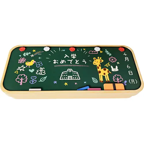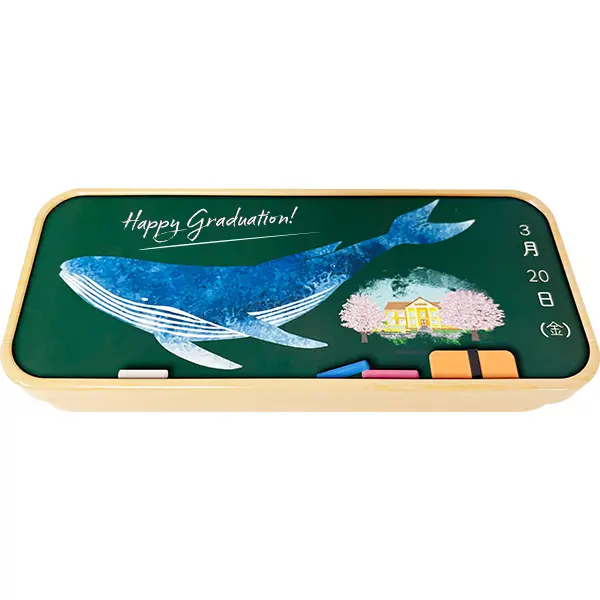 ”大海に出る”出発をイメージして、クジラが大胆に描かれたデザインと。 入学を祝い、かわいらしいイラストを沢山施したデザイン2種があります。 中にはチョークを模したキャンディが赤×1本・白×1本入っています。