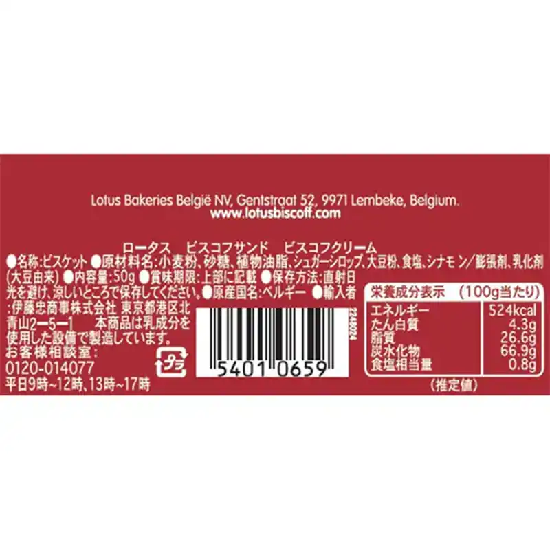 | 備考 | ロータスビスケット(ビスコフ/オリジナルカラメルビスケット)は、世界中のホテル・レストラン・飛行機内などで、コーヒーや紅茶によく合う美味しいビスケットとして多くの人から愛されています。 |