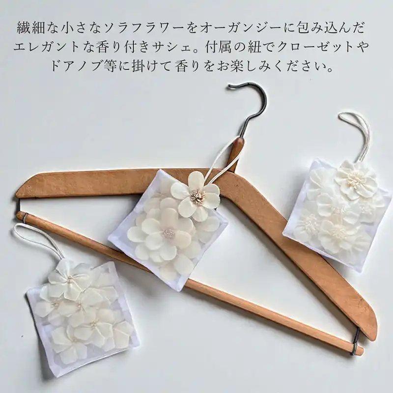繊細な小さなソラフラワーをオーガンジーに包み込んだ、エレガントな香り付きサシェです。