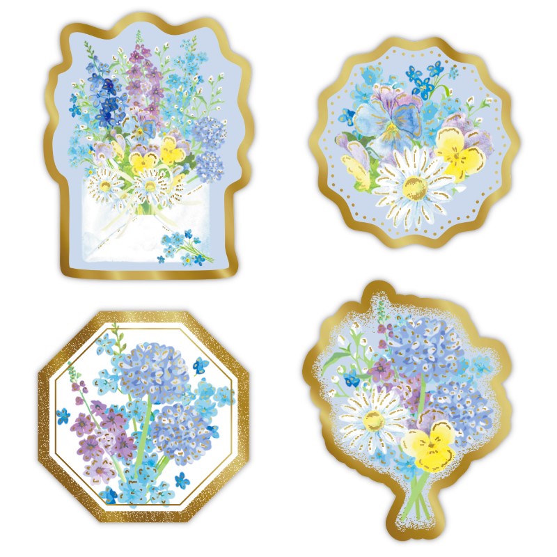 「My Posy(マイポージー)」の箔入りフレークシール。花束を中心に描いた華やかで彩り豊かなデザインは、母の日などのギフトシーンにもおすすめです。