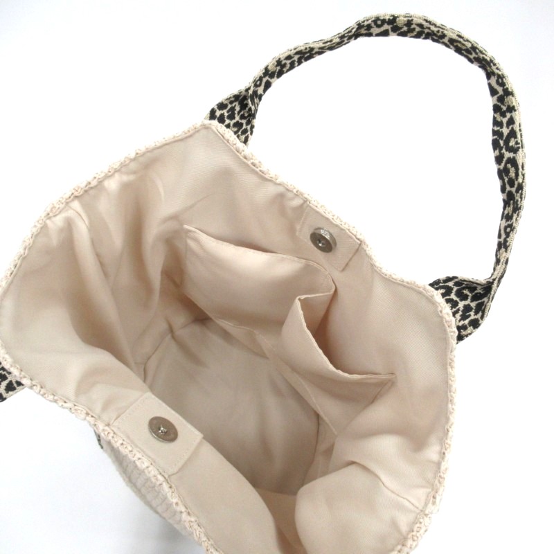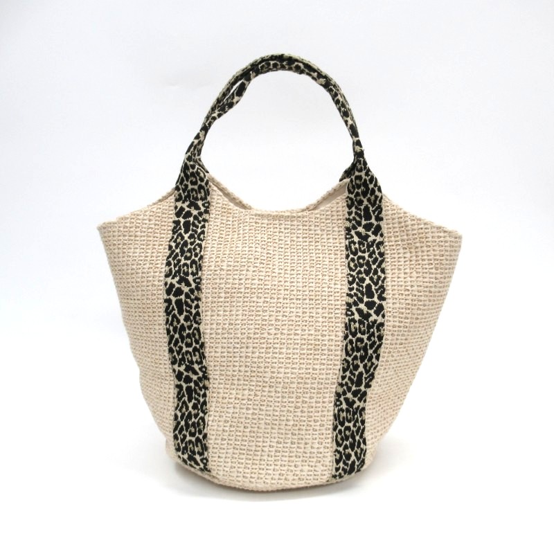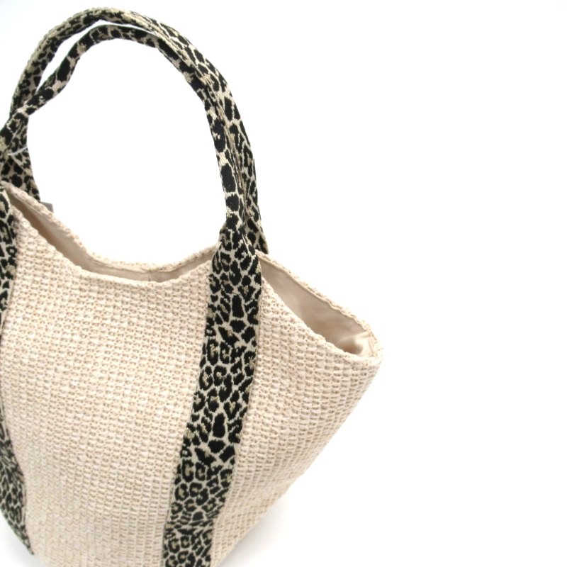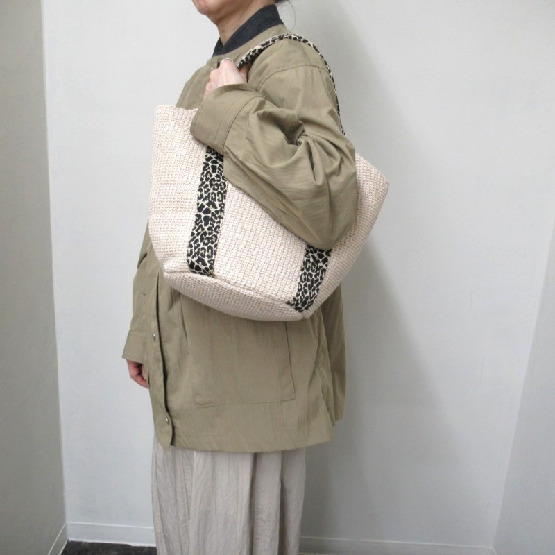 アイボリーのメッシュ編み雑材にレオパード柄のテープを使い、上品な雰囲気に仕上がったトートバッグ。